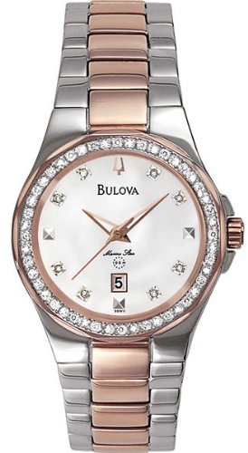 Bulova 98W11 Diamond Series Mother of Pearl Dial Women's Watch. Mother of Pearl dial, diamonds on bezel, quartz movement, two-tone stainless steel, water resistant up to 330 ft / 100 m, scratch resistant mineral crystal.