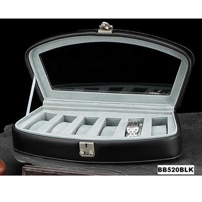 Padded leather case has an all-around zip plus a key-lock closure for extra security. Holds six watches. Fully lined interior.