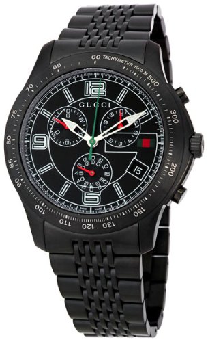 Stainless steel case with a black PVD stainless steel bracelet. Fixed black PVD bezel with tachymeter. Black dial with luminous hands and stick hour markers. Arabic numerals mark the 6, 9 and 12 o'clock positions. Minute markers around the outer rim. Date display at the 4 o'clock position. Chronograph - three sub-dials displaying: 60 seconds, 30 minutes and 1/10th of a second. Swiss quartz movement. Scratch resistant synthetic saphire crystal. Screwed down crown. Screwed down solid case back. Case diameter: 45 mm. Case thickness: 11 mm. Deployment clasp. Water resistant at 30 meters / 100 feet. Gucci Timeless Mens Watch YA126217.