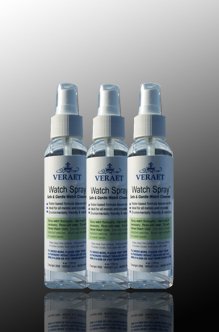 The safest and gentlest watch cleaner available today. Since its early inception in January of 2009, Watch Spray has been the first watch care product to premiere in the International Watch Magazine, Antiquorum's Timezone.com, and in the museum store at The National Association of Watch and Clock Collectors.Unique to traditional jewelry cleaners and types of hand soap, Watch Spray is a safe and gentle water-based formula that acts as a rinse, cleaning the watch of any film, oil, or dirt. It contains no abrasives, glycerin (found in soap causing film buildup), harsh ammonia, or acid. Have you ever tried using soap and felt an oily buildup on the watch case and/or bracelet? Have you ever taken a whiff of a jewelry cleaner? Most smell like an industrial cleaning solution. Harsh jewelry cleaners often contain ammonia or dangerous surfactants that may work well on diamonds and other jewelry, but are not intended for watches.Recommended use is on a weekly basis to maintain the factory finish on your watch, while keeping the case and/or bracelet film-free. Possesses a pleasant, fresh fragrance. Comes individually boxed. Intended for water-resistant watches only. Size is 4 oz/118 ml. (average duration per bottle is 2-4 months)Includes: 3 PACK of Watch SprayAvailable Stores