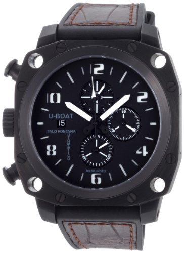 The U-Boat Men's Thousands of Feet Watch boasts the unmistakable style expected from a high-end Italian timepiece. This watch's stainless steel case is styled like an airplane gauge and provides a home for its attractive black dial. This dial boasts white baton and Arabic hour markers and white hands and subdials at the three, six, and twelve o'clock positions. A date window at the nine o'clock position helps you keep tabs on your busy schedule. At the nine o'clock position is a subtle reminder that this attractive timepiece was made in Italy. An antireflective sapphire crystal protects the dial face from scratches. Keeping all of this confidently on your wrist is a textured and stitched calfskin band that closes with a traditional buckle. Other features include water-resistance to 330 feet (100 meters) and Swiss automatic movement, a feature that means this watch will never need a battery as it's powered by the movement of your arm.